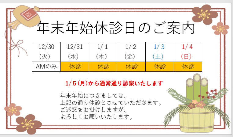 年末年始の休診のお知らせです。
